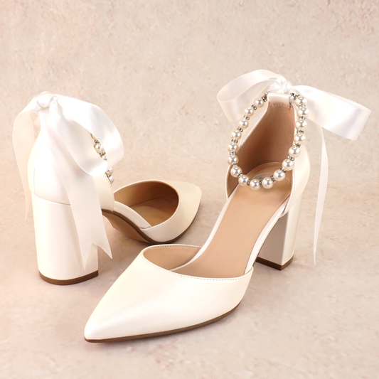 Julian Block Heels with Pearl Ribbon Ankle Tie